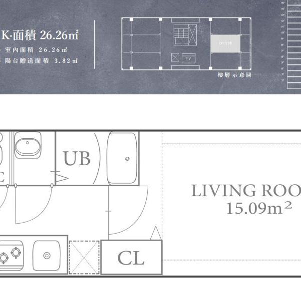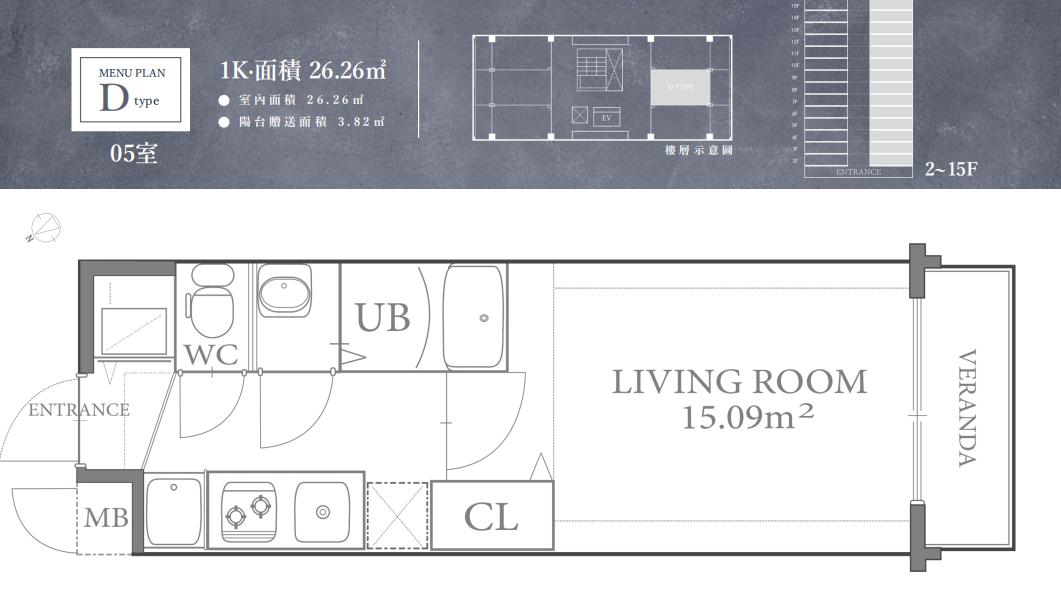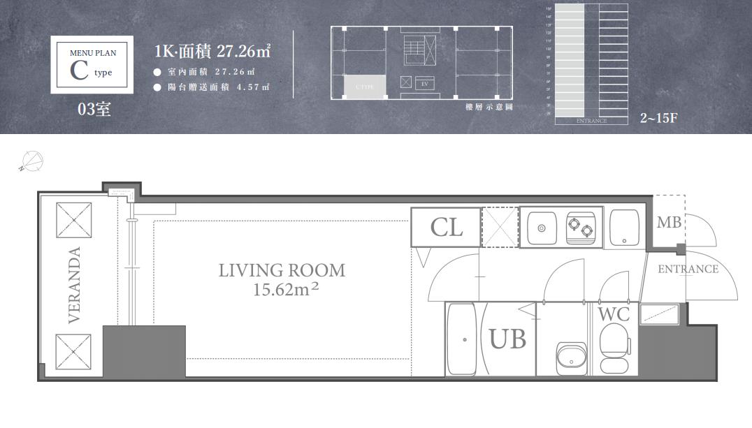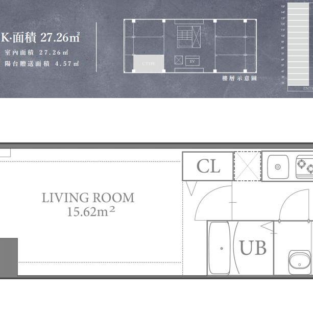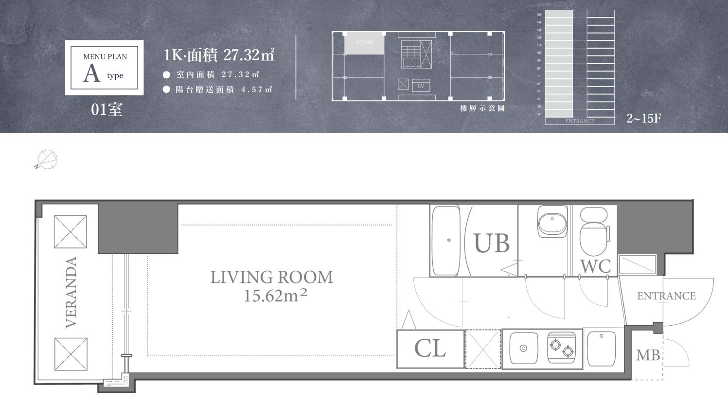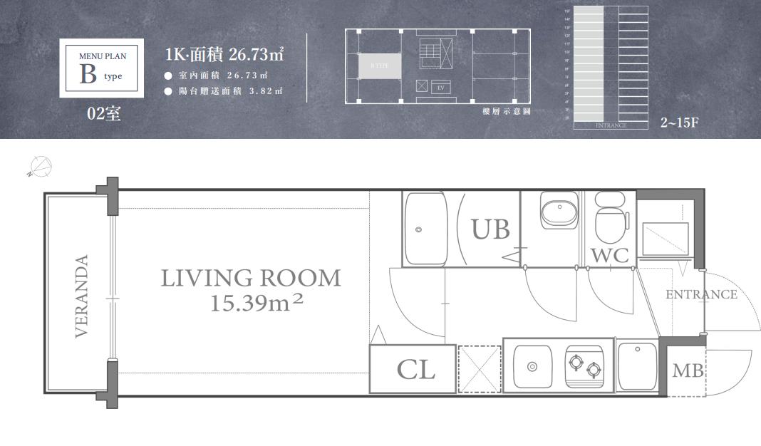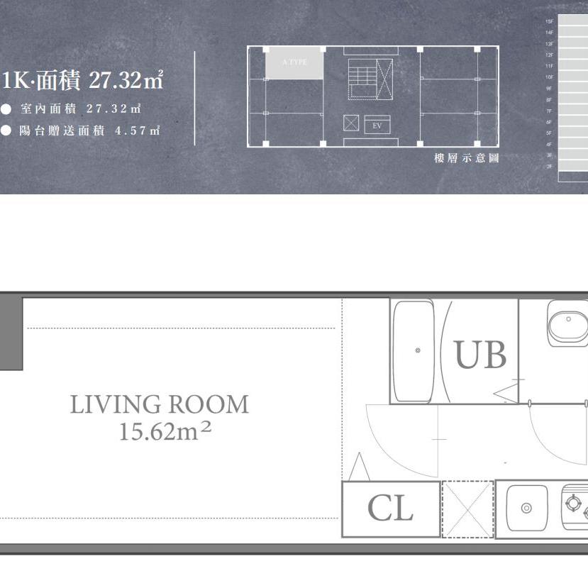 這間房屋設有2間臥室、1間浴室,總面積約為 27.32 (m2) ,14樓層。