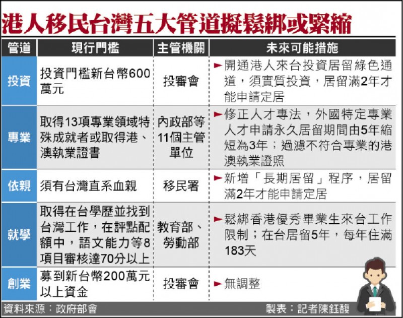 不過,部份政策仍對港澳人士相當鬆綁,例如在台灣求學的港澳青年,現時申請定居條件,是需要在台灣找到工作,並經過8項能力考核,新政策會放寬限制,讓港澳年輕人來台就學、就業,相信可延攬35歲以下的優秀人才來台。